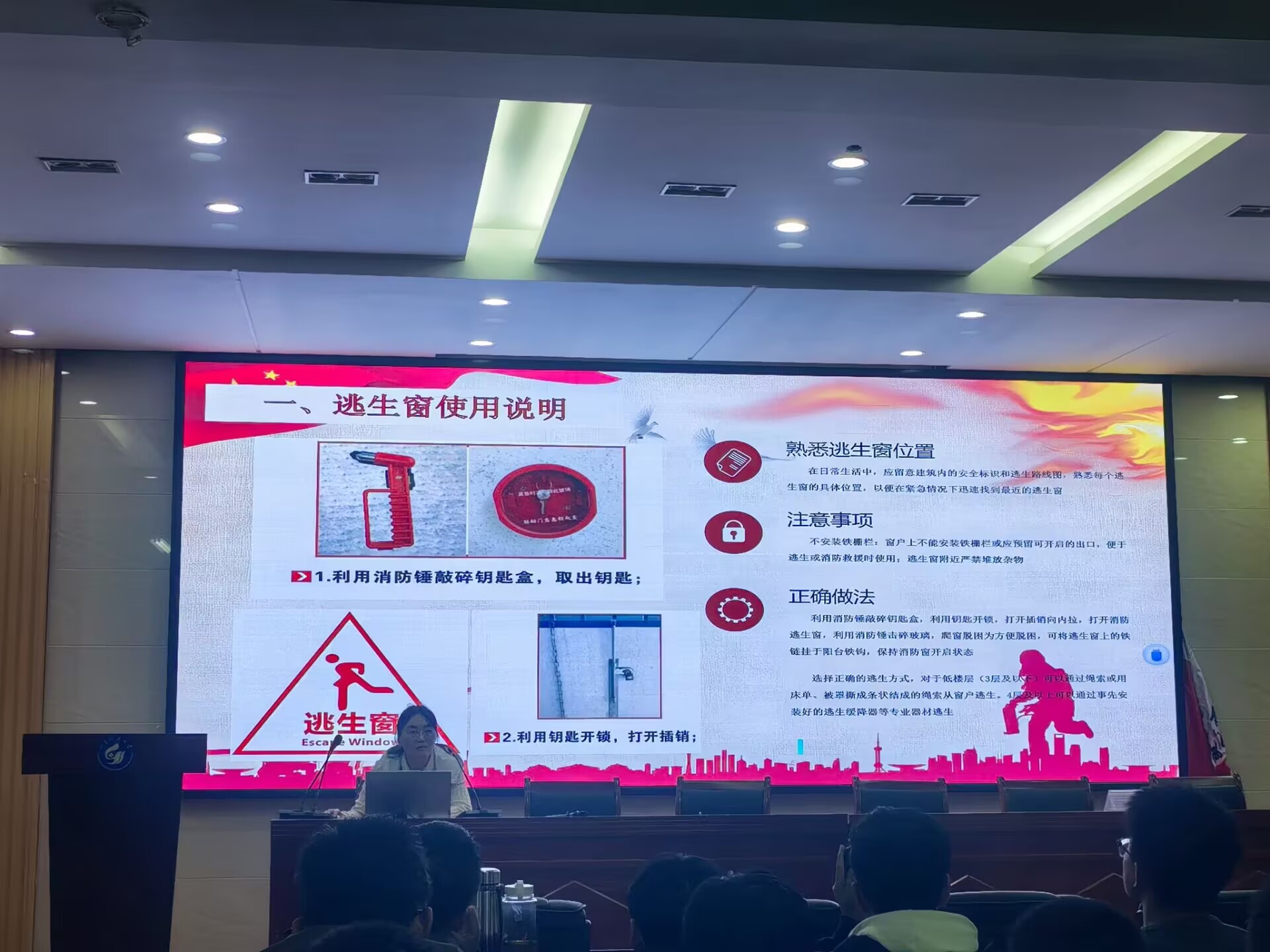 本次自查重点检查了逃生窗钥匙是否缺失、能否正常使用、逃生窗能否正常开启等问题,通过现场演示和实际操作的方式,让员工基本掌握紧急情况下熟练打开逃生窗的逃生方法。培训会上,辅导员老师结合近期的各类典型火灾案例,用通俗易懂的语言,深入浅出地对逃生窗及逃生锤的使用方法进行讲解。培训过程中,同学们认真听讲,积极讨论,收获颇多。