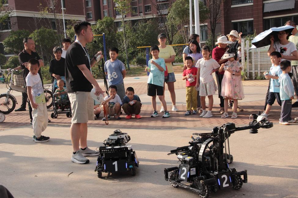 活动筹备阶段,协会成员提前抵达现场,有序完成集合分工、场地布置与机器人调试工作,以饱满的热情迎接社区居民的到来。下午 3 点,主持人宣布活动正式启动,精心筹备的机器人展示环节随即拉开帷幕。灵活穿梭的竞技机器人、精准完成动作的演示机器人,引得现场小朋友们阵阵惊呼,纷纷围拢驻足。工作人员一边发放科普宣传单,一边用通俗易懂的语言讲解机器人的工作原理与发展历程,让孩子们在近距离观察中初步感受科技魅力。